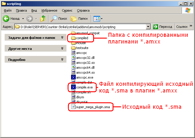 *.sma - исходный код на языке скриптинга PAWN *.amxx - плагин AmxModX *.inc - дополнительный модуль, требуемый для корректной компиляции плагина